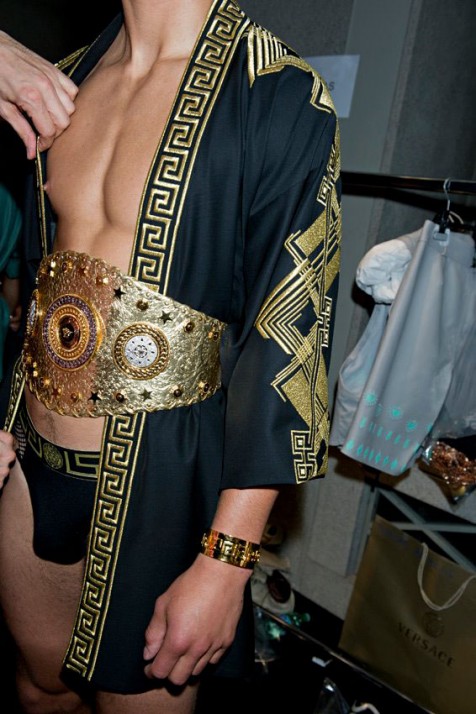 For Spring/Summer 2013 the Versace man is a tough pugilist champion at the top of his game. Part Rocky, part Elvis and part Mr. T, the look combines heavyweight jewellery and featherweight filigree, iridescent parkas that double for ringside robes, and punchy pastels. This is a celebration of man as modern-day gladiator. And he’s not afraid to make an entrance.